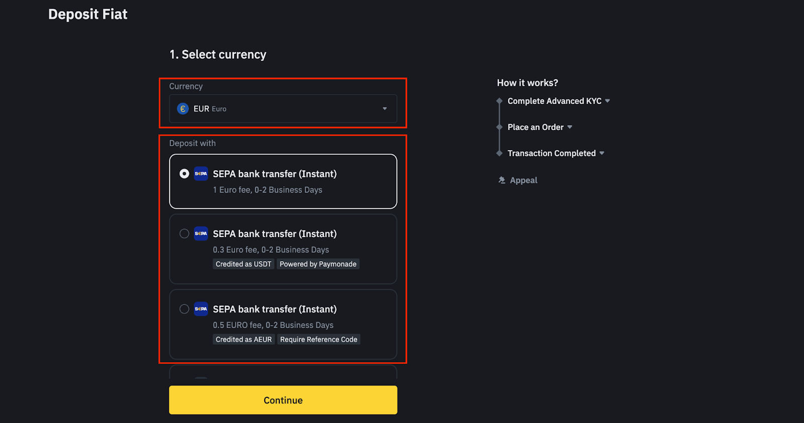 2. 选择您想要充值的法币,然后从提供的银行转账方式选择一个。